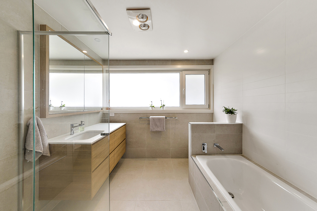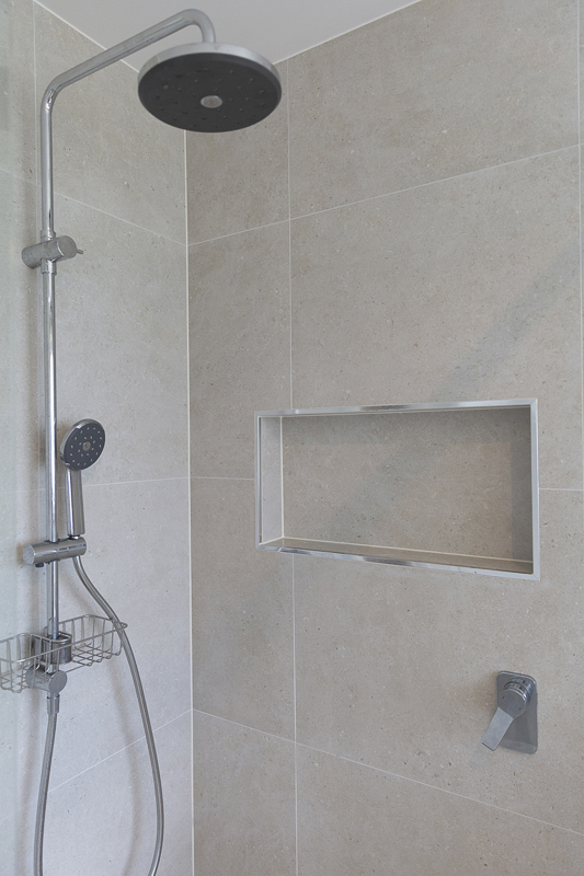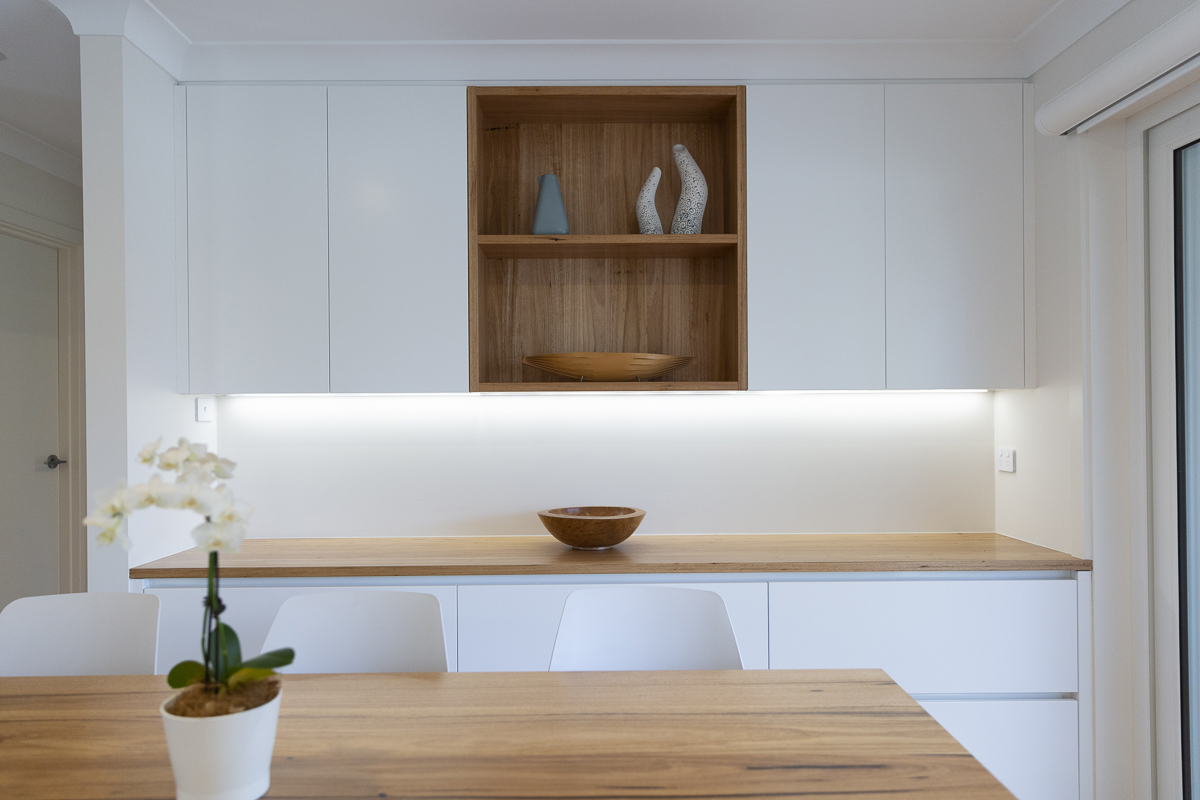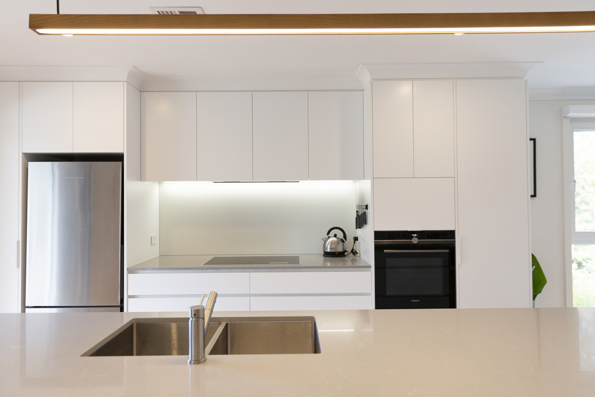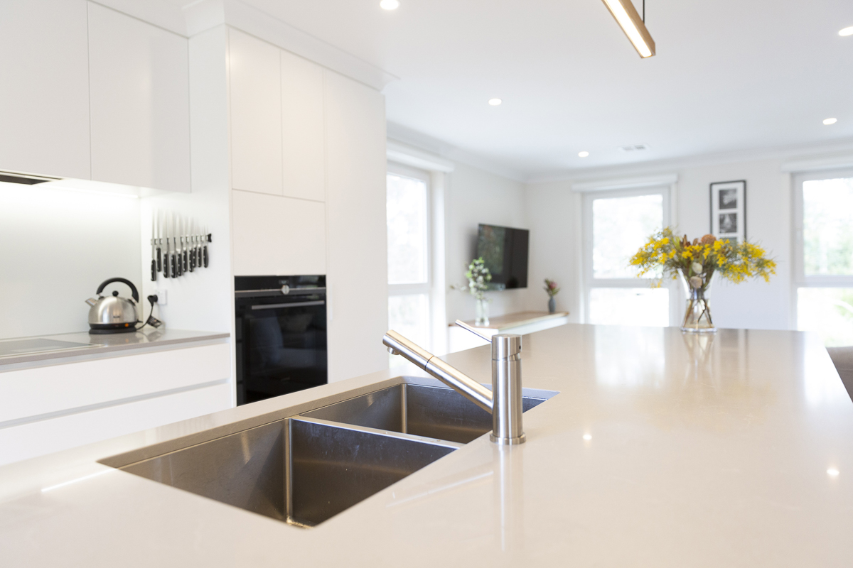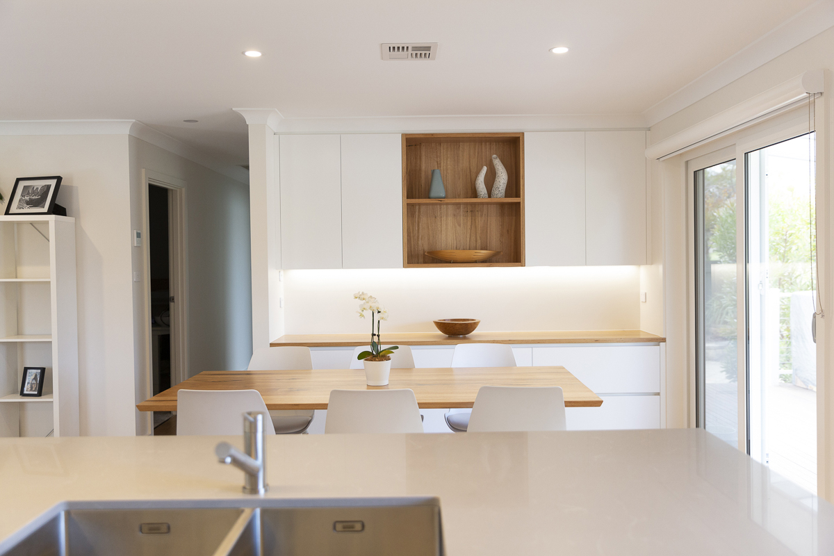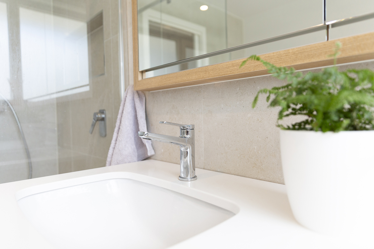 Bringing the home into the now meant an overhaul of the outdated wet areas. We removed the old kitchen, which Simplicity replaced with beautiful and functional cabinetry with Quantum quarts benchtops and a feature glass splashback.