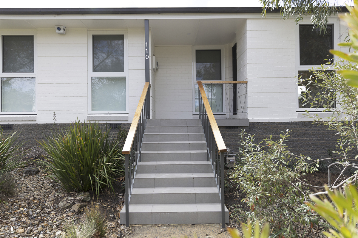 Outside, we refreshed the entry, shifting the front door entrance to make it more spacious, painting the exposed bricks and the existing stainless-steel balustrade, and adding a new Blackbutt timber handrail, to match the front door.